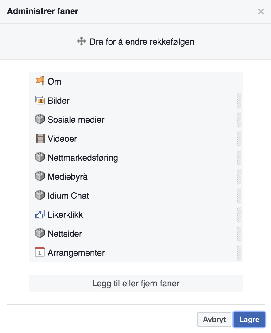 - Tilpassede faner: Facebook tillater bedriftssider å lage tilpassede faner som passer dine behov/mål. Dette er en god måte å fremheve eget innhold på. For å tilby en bedre brukeropplevelse kan markedsførere (les: du) bygge inn landingssider i en tilpasset fane, og endre rekkefølge på dem ut ifra fokus/ønsker og behov. Dette gjør at de som er på din Facebook-side ikke trenger å forlate Facebook for å kunne melde seg på et event eller lignende, noe som gir en bedre brukeropplevelse og høyere konverteringsrate.
