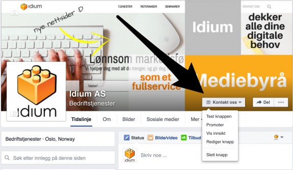 - Facebooks egne Call-to-Action (handlingsoppfordring): Facebook kom i desember 2014 med et praktisk nytt tilbehør hvor du kan inkludere en CTA-knapp direkte på din side. Foreløpig er alternativene: Bestill nå, Kontakt oss, Bruk app, Start spillet, Kjøp nå, Registrer deg og Se video. Ifølge Facebook gir CTA-knappen en 2.5 gang høyere konverteringsrate.