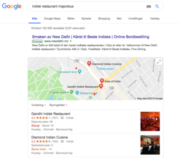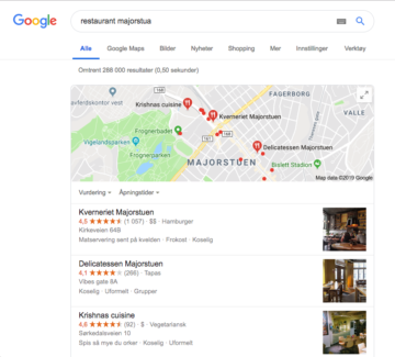 Si at du søker etter en restaurant, de første resultatene vil som regel inkludere betalt søk (Google Ads) etterfulgt av et kart som viser alle restaurantene i ditt område eller det området du søkte for. Og noen ganger, dersom søket ikke er så spesifikt dukker faktisk kartet opp først.